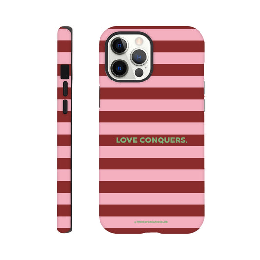 Christliche Handyhülle in Rosa Rot – 'Love Conquers' Motiv für tägliche Inspiration