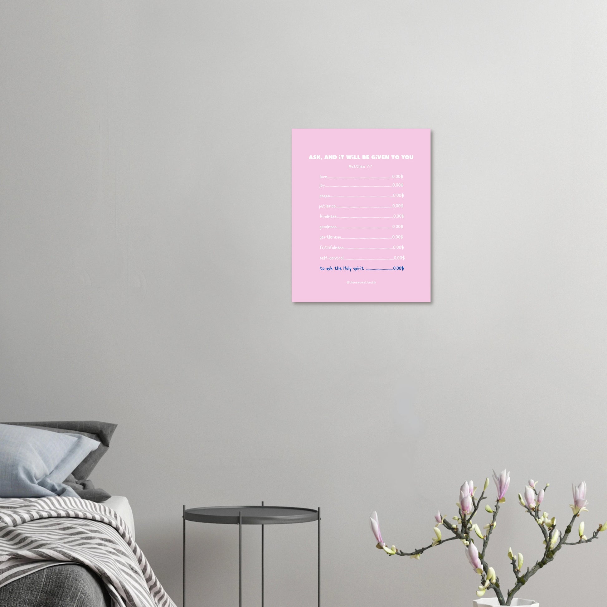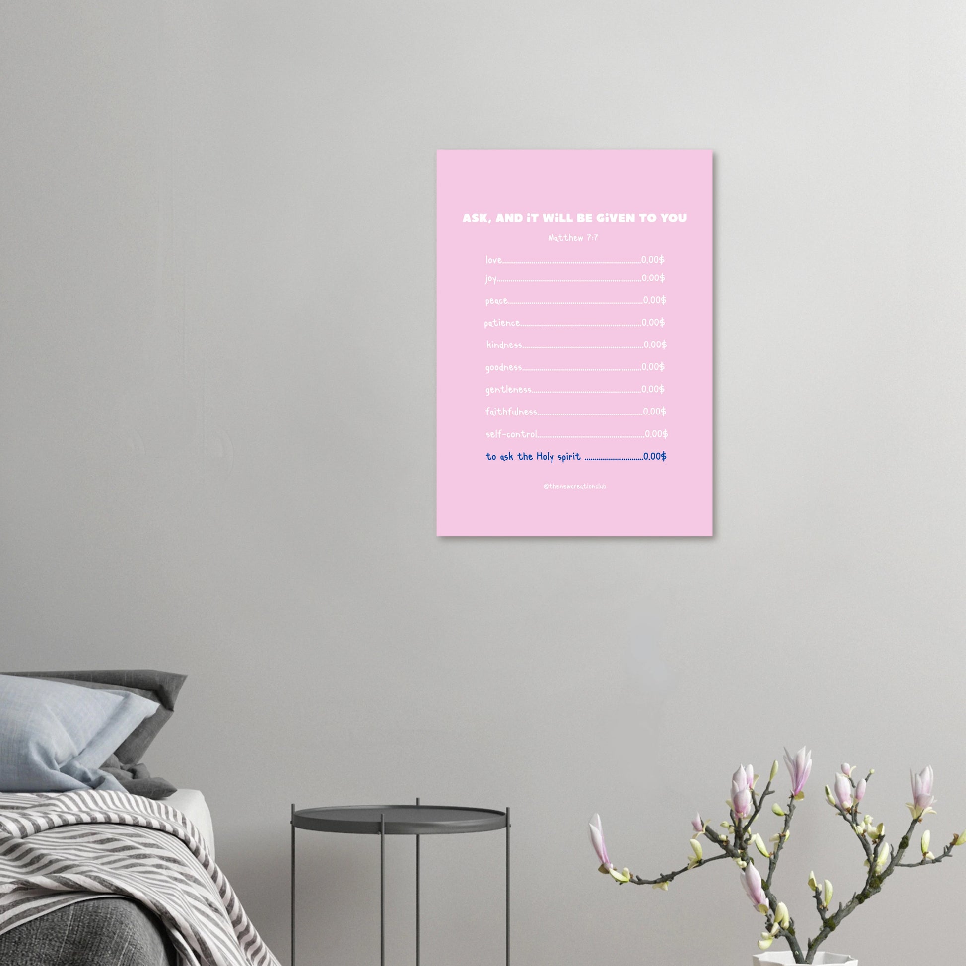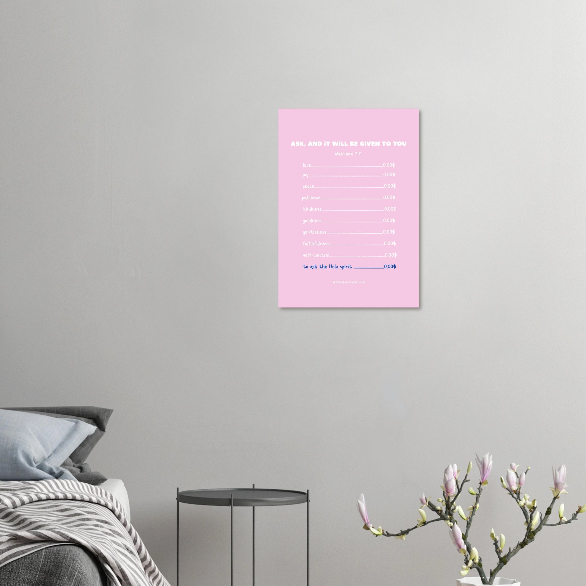 Bereichere dein Zuhause oder dein Büro mit unserem inspirierenden Christlichen Poster, das die Botschaft 'Ask and it will be given to you' trägt. Dieses ansprechende Design listet die Früchte des Heiligen Geistes auf und erinnert uns daran, dass Gott uns mit wichtigen Eigenschaften ausstattet, die uns im Leben leiten.